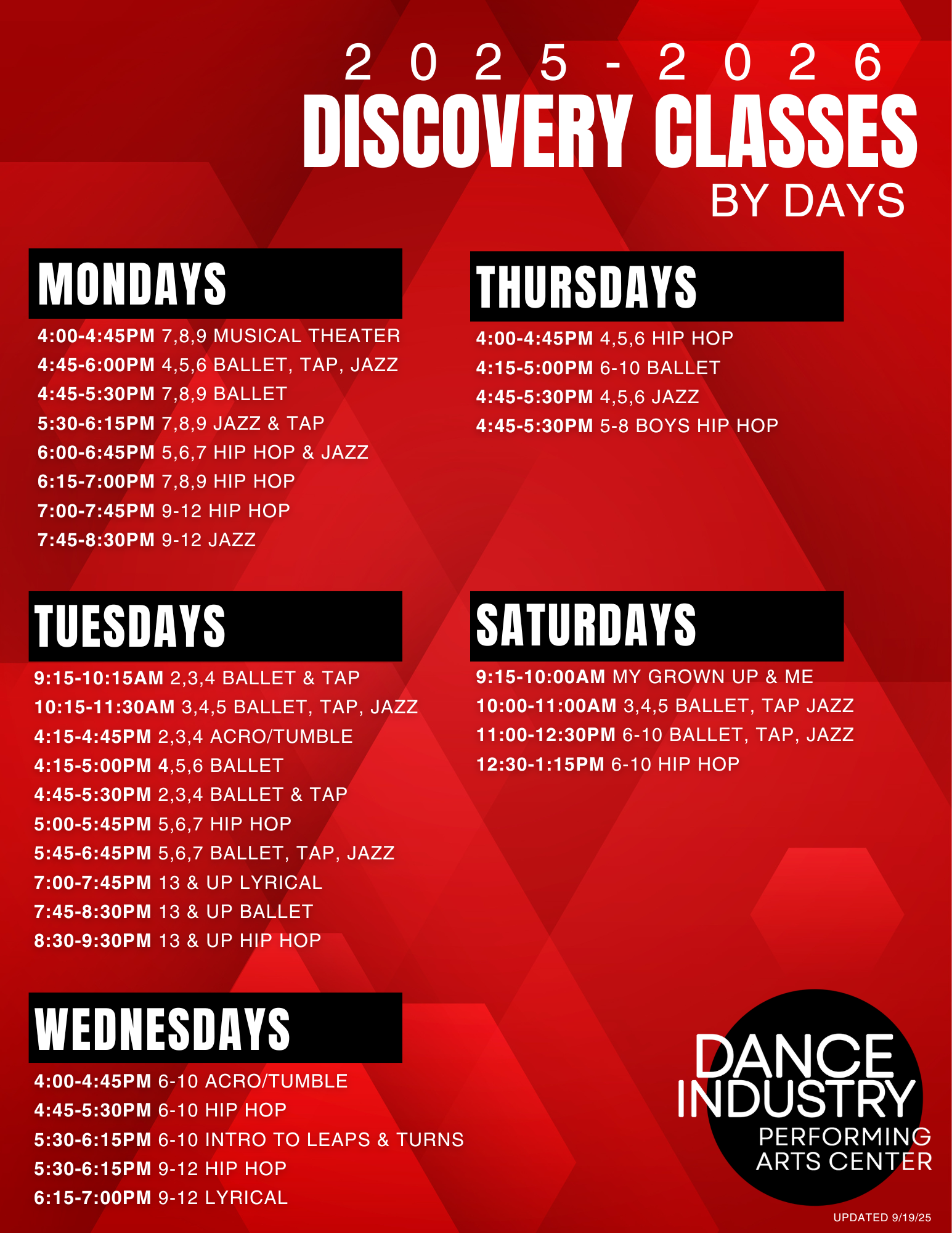 We will work on building a solid foundation of strength, balance, and body awareness while learning skills such as rolls, cartwheels, handstands, walkovers, aerials, and more—always progressing safely at their own level. Dance Industry is Acrobatics Arts Certified with Liz Nguyen as our lead instructor.